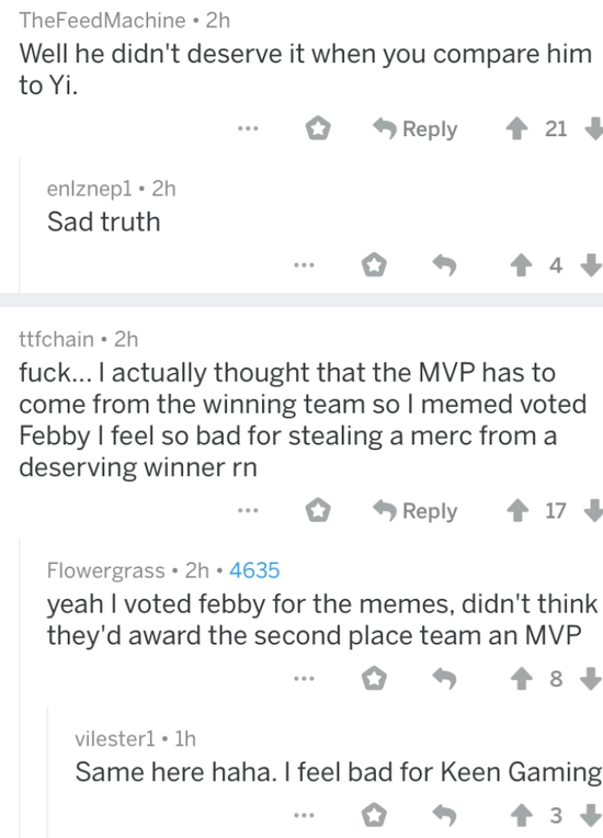 —操,我不断以为MVP肯定是胜者,所以我跟着节拍投了Febby,我如今觉得好对不起KG,让他们丢了飞驰。