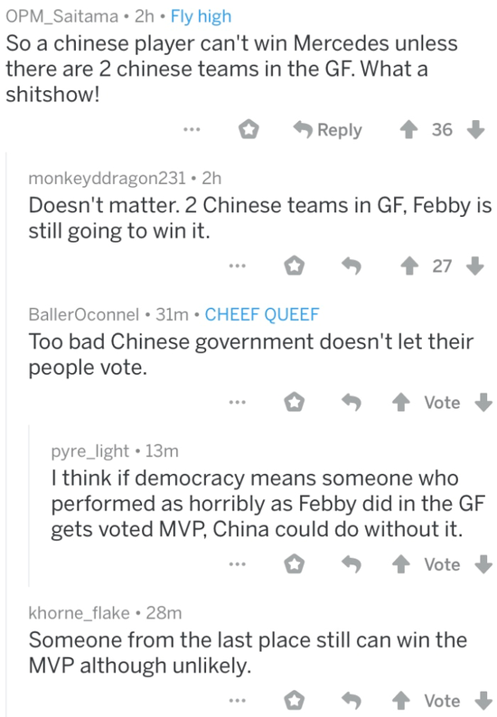 ———我觉得假如所谓的“民主”意味着像Febby在决赛里打得这么差的选手也能得MVP,那中国不需求这样的“民主”。