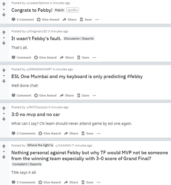 上台领奖的Febby自己也一脸懵逼,在致辞的时分表示本人并配不上MVP的称号以及这辆飞驰车。这个结果出乎了一切人的意料,国内与国外的社交平台上,网友们都提出了质疑——为何MVP不给冠军队伍的成员?