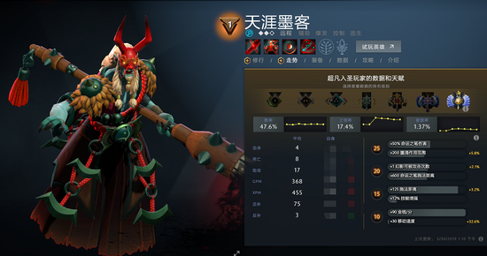 有一位英雄的胜率、禁用率都没有很大变化,7.22版本也没有停止明显的增强,但这位英雄最近退场率提升幅度,居一切英雄之首。5月24日,2019DOTA2国际约请赛勇士令状发放了365级等级奖励,撼地者至宝“天外飞星”参加游戏。这一饰品以优秀的质量、炫酷的特效吸收了许多玩家在游戏中运用,退场率的提升也就在道理之中了。