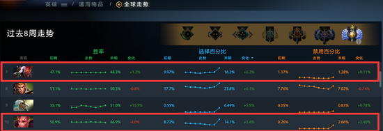 除了提到的几位英雄,还有一些英雄在7.22版本的表现值得关注。殁境神蚀者的“衡势”技艺得到增强,被动提供回蓝效果,简化了殁境神蚀者的操作,让这一英雄的胜率呈现了不小的变化;斯拉克在得到了增强后,胜率也有了不小的上扬,即便在7.22b中对他做出了削弱,这一英雄也已有了上场的时机,退场率逐渐提升。
