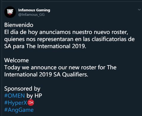 在Ti9预选赛开赛在即的时辰,南美豪强Infamous战队官方宣布原Anvorgesa战队4人的加盟,他们将代表Infamous参与行将开启的Ti9预选赛。