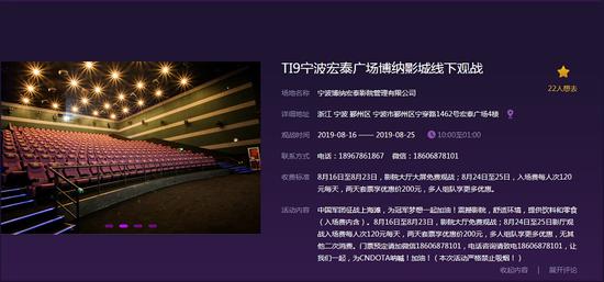 宁波的DOTAer今夏有福了!宏泰广场博纳影城在今夏欢送DOTAer前往观赛,中国军团征战上海滩,为冠军幻想一同加油!震动影院,温馨环境,提供饮料和零食(入场费内含)。8月16日至8月23日,影院大厅免费观战;8月24日至25日影厅观战入场费每人次120元每天,两天套票享优惠价200元,多人组队享更多优惠,无其他二次消费。只是各位喜欢吸烟的玩家,可得忍忍了!