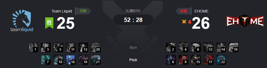 52分钟,Liquid带盾推进,拉席克25级的恶魔敕令疾速拆掉了EHOME基地,拿下了竞赛。