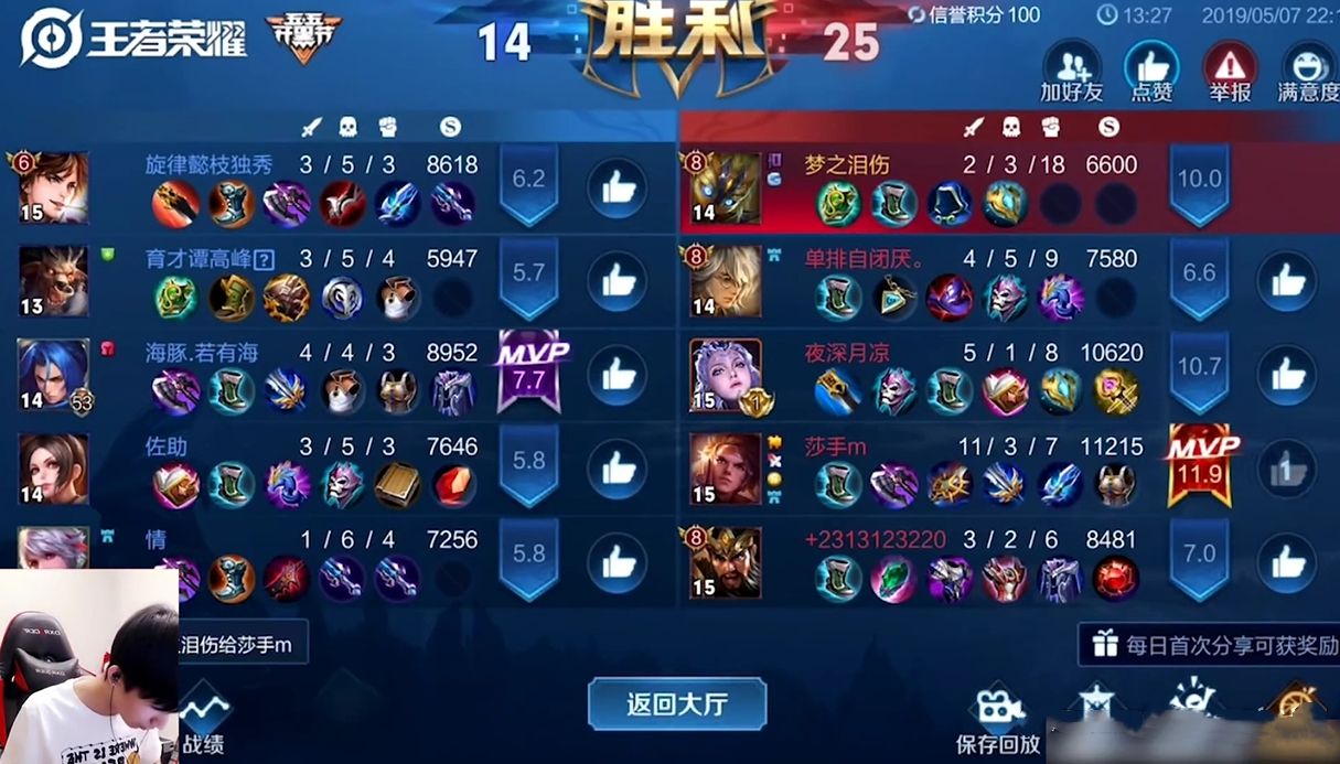 到了最后,我们可以看到梦泪还很开心地给莎手m点了个赞,果然是合格的迷弟。但是互赞这种商业互吹,不是铂金的我才干的事吗?好吧,互吹不分段位……