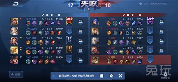 第二局比较精彩,不到10分钟的小局爆发出三十多个人头,其中广大GZU.CC所使用的关羽在对线到TS.小贱贱马超时,接连打出单杀操作。而GZU.貔貅拿出改版后的杨玉环上场,配合太乙真人中辅联动打出大顺风局,在群奶+复活的套路下,GZU.貔貅的一手杨玉环杀到超神,评分达到高分14.1,并且参团率、输出占比都是全场最高。