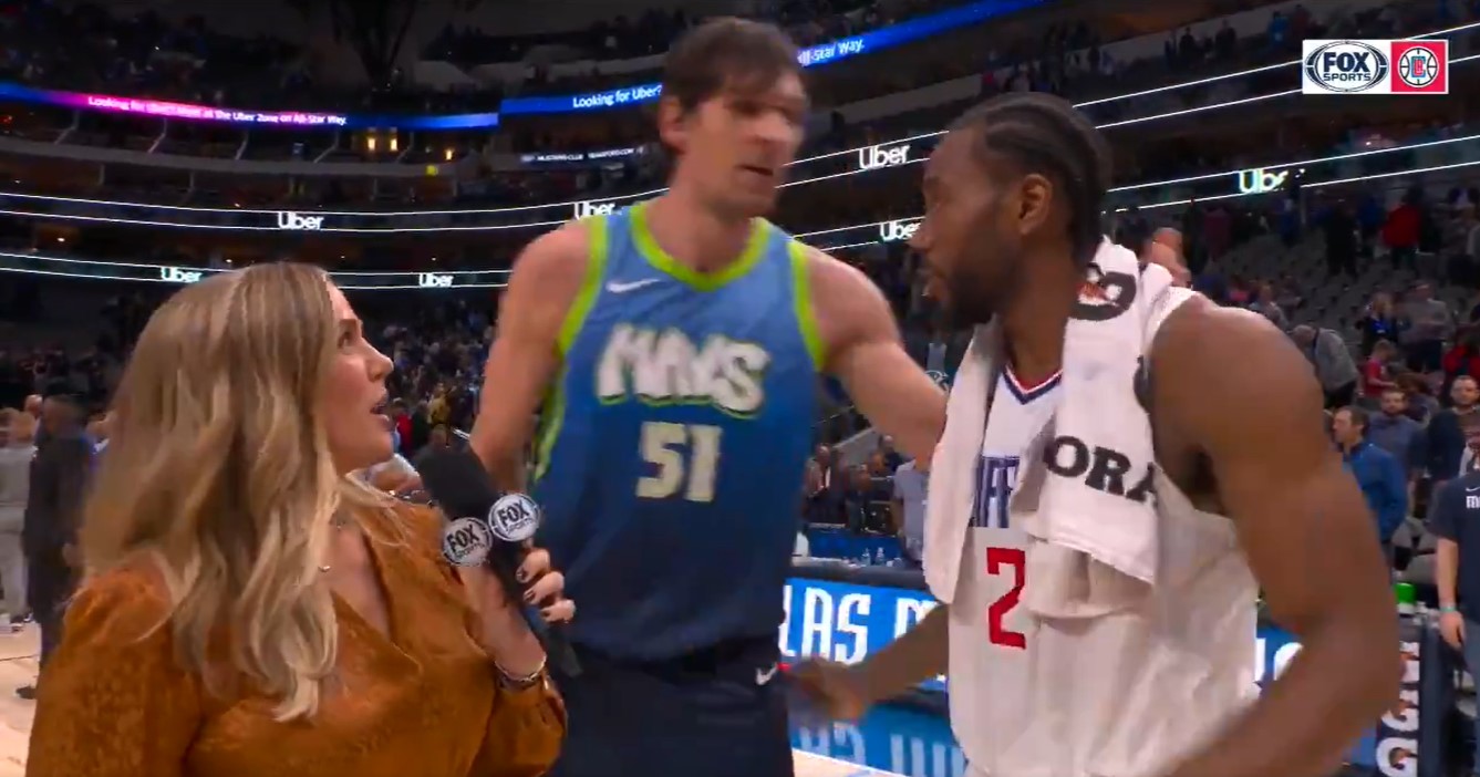 赛后,快船前锋科怀-伦纳德在接受场边采访前,独行侠中锋博班-马里亚诺维奇前来与昔日队友伦纳德拥抱问候。