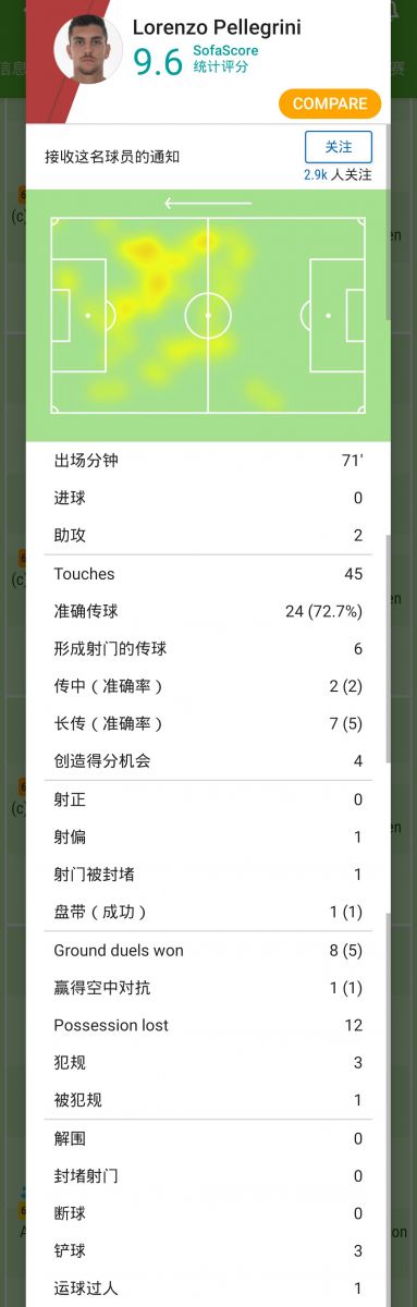 sofascore数据统计显示,佩莱格里尼本场比赛出场71分钟,贡献了两脚助攻,触球45次,准确传球24次,传球成功率高达72.7%,其中6脚传球直接帮助罗马形成射门机会,两次长传全部命中,7脚传中5次成功,共创造了4次得分机会,8次盘带5次成功.全场比赛,佩莱格里尼获得了9.6分的全场最高评分。