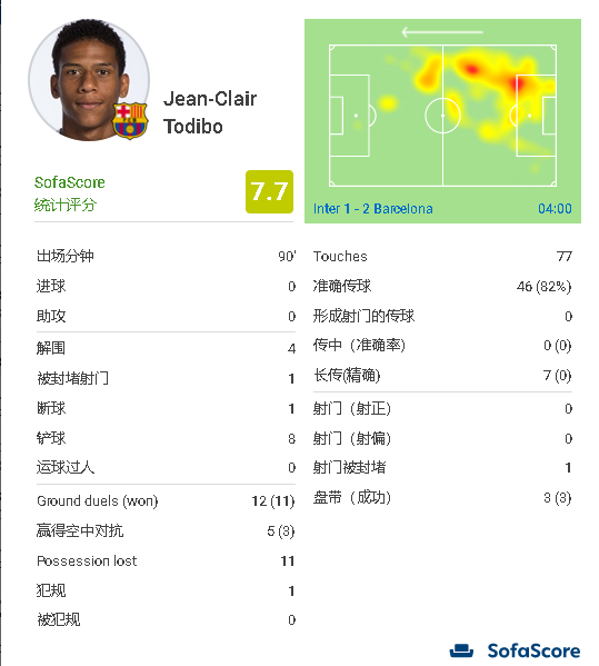 在北京时间今天凌晨结束的欧冠小组赛F组的一场较量中,巴塞罗那客场2-1战胜国际米兰,小组头名不败晋级。本场比赛,巴萨后卫托迪博贡献了8次成功抢断,12次地面对抗11次成功,发挥十分出色。