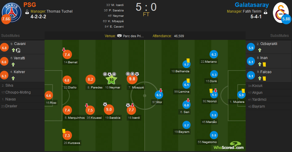 内马尔2传1射获得全场最高的满分10分,姆巴佩同样2传1射并创造一粒点球获得9.8分;加拉塔萨雷方面,莫尔获得全队最高的6.5分。