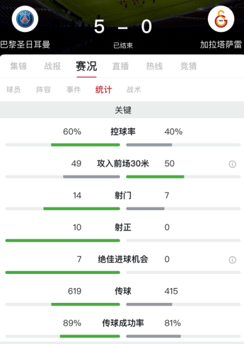 巴黎占据优势,全场控球率60%,加拉塔萨雷控球率40%,巴黎全场14次射门10脚射正获得7次绝佳进球机会取得5粒进球,加拉塔萨雷全场7次射门没有一次射正未取得进球。