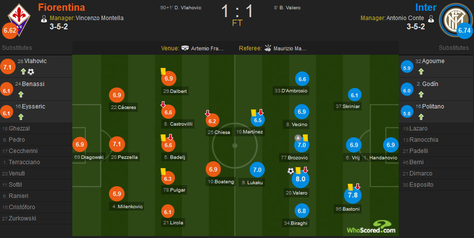 巴莱罗破门获得全场最高的8.0分;佛罗伦萨方面,替补出场的弗拉霍维奇绝平获得全队最高的7.1分。