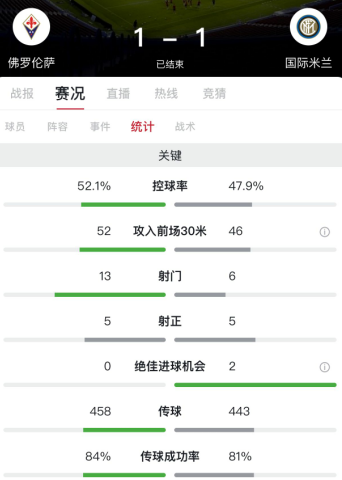 两队控球不分上下,佛罗伦萨控球率52.1%,国际米兰控球率47.9%,佛罗伦萨全场13次射门5脚射正取得1粒进球,国际米兰全场6次射门5脚射正获得2次绝佳进球机会取得1粒进球。