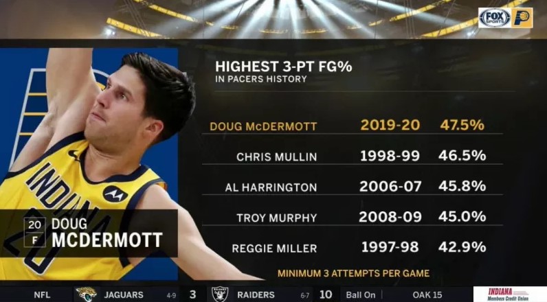 本赛季至今,麦克德莫特三分球命中率达到47.5%。同时,根据数据统计,麦克德莫特本赛季目前的三分命中率也创造了步行者队史以来最好的纪录。