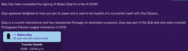 模拟结果显示1月8日,曼城以5300万英镑的价格签下了本菲卡中卫鲁本-迪亚斯,这名22岁的葡萄牙国脚的各方面能力都十分均衡,并且有着不错的传球和出球技术,这也使得他获得了曼城的青睐。