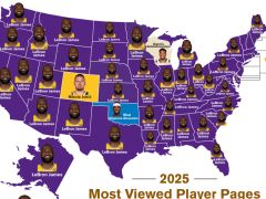 人气王!BBR年度浏览量排名:詹姆斯霸榜47州 约字亚各占1个州 北京时间12月11日,据数据网站BBR显示,其网站今年在各州被浏览次数最多的球员页面分别是:詹...