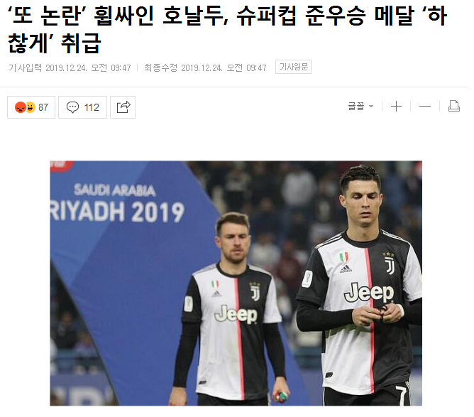 北京时间12月24日消息,C罗登上韩国媒体封面,意大利超级杯,尤文图斯1-3不敌拉齐奥,赛后颁奖典礼,C罗不开心,很快将脖子上的银牌摘了下来。韩媒《Best Eleven》认为,C罗是自私的存在,只关注自己,不为他们考虑。 事实上,韩国媒体