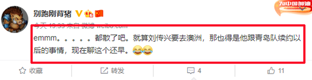 如今,刘传兴能否去澳洲,成为球迷们唯一关心的事情。对此,名博“别跑刚背猪”在网络上表示:“emmm……都散了吧。就算刘传兴要去澳洲,那也得是他跟青岛队续约以后的事情,现在聊这个还早。”这样的说法,则给人泼冷水了。因为作为一名知名的体育博主,他应该是更加清楚CBA的相关规则的。如此一来,刘传兴能否去澳洲,还是要看青岛队的态度了。