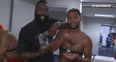 在现场,登哥遇到了拜仁的边锋格纳布里,值得一提的是格纳布里在进球之后他的招牌庆祝动作和哈登此前的撒盐庆祝如出一辙,两人也是合影同时做出了撒盐动作!