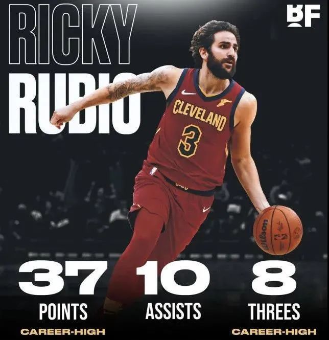 37分是卢比奥的生涯新高,8记三分也是。卢比奥也创造了纪录:他成为NBA历史上第一位替补出场在比赛中得到30+得分、10+助攻、8+三分球的球员。
