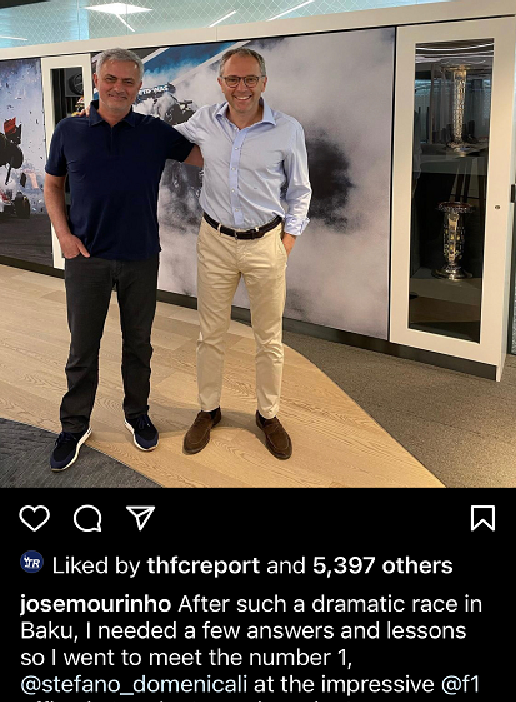 最后是穆帅的私生活,穆帅发布了社交媒体,他前往伦敦的F1总部,向F1主席多梅尼卡利请教F1的问题了。许多球迷不知道的是,穆里尼奥还是一个F1迷,此前他从曼联下课之后,就曾经前往法国现场观看F1比赛,而且还为自己喜爱的赛车手助威,看来穆里尼奥的爱好还是很多的,就是不知道穆帅未来会不会去尝试一下,玩玩FI赛车呢?
