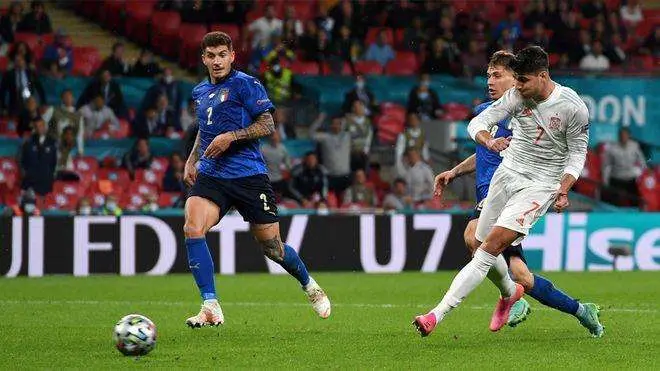 意大利与西班牙鏖战120分钟,不分胜负。点球大战中,首轮双方都罚丢点球,之后本场比赛的扳平比分的功臣莫拉塔罚丢了关键点球。