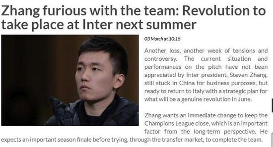 本轮联赛,国际米兰1-2不敌卡利亚里。目前因公回到中国的张康阳不满球队现状和表现,他将带着一个“战略性计划”回到国米,准备在今夏对球队进行一番“真正的革命”。