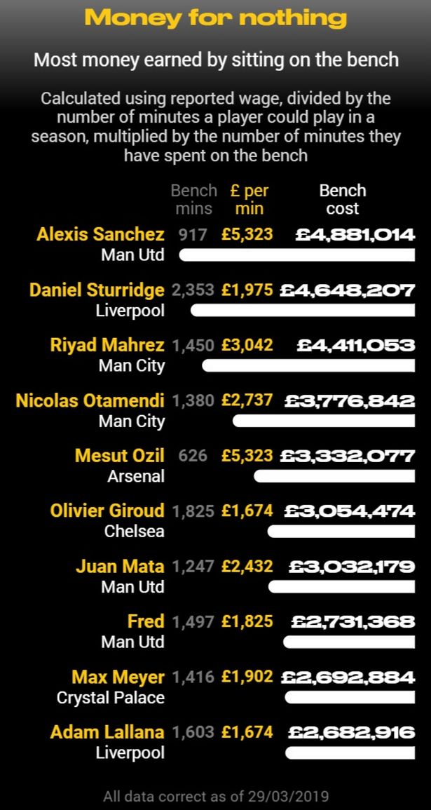 这份报告援引了今年4月一份调查中的数据,该报告显示,上赛季(截止到3月末),桑切斯入选曼联大名单却替补未出场的总时间长达15小时17分钟,在此期间,桑切斯累计拿到488万(4881014)英镑,平均每分钟收入5323英镑(约合46577元人民币)。